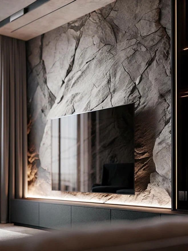 Дизайнерские решения оформления стен – имитация скал, микроцемент, декоративная штукатурка, барельефы, фито-стены.